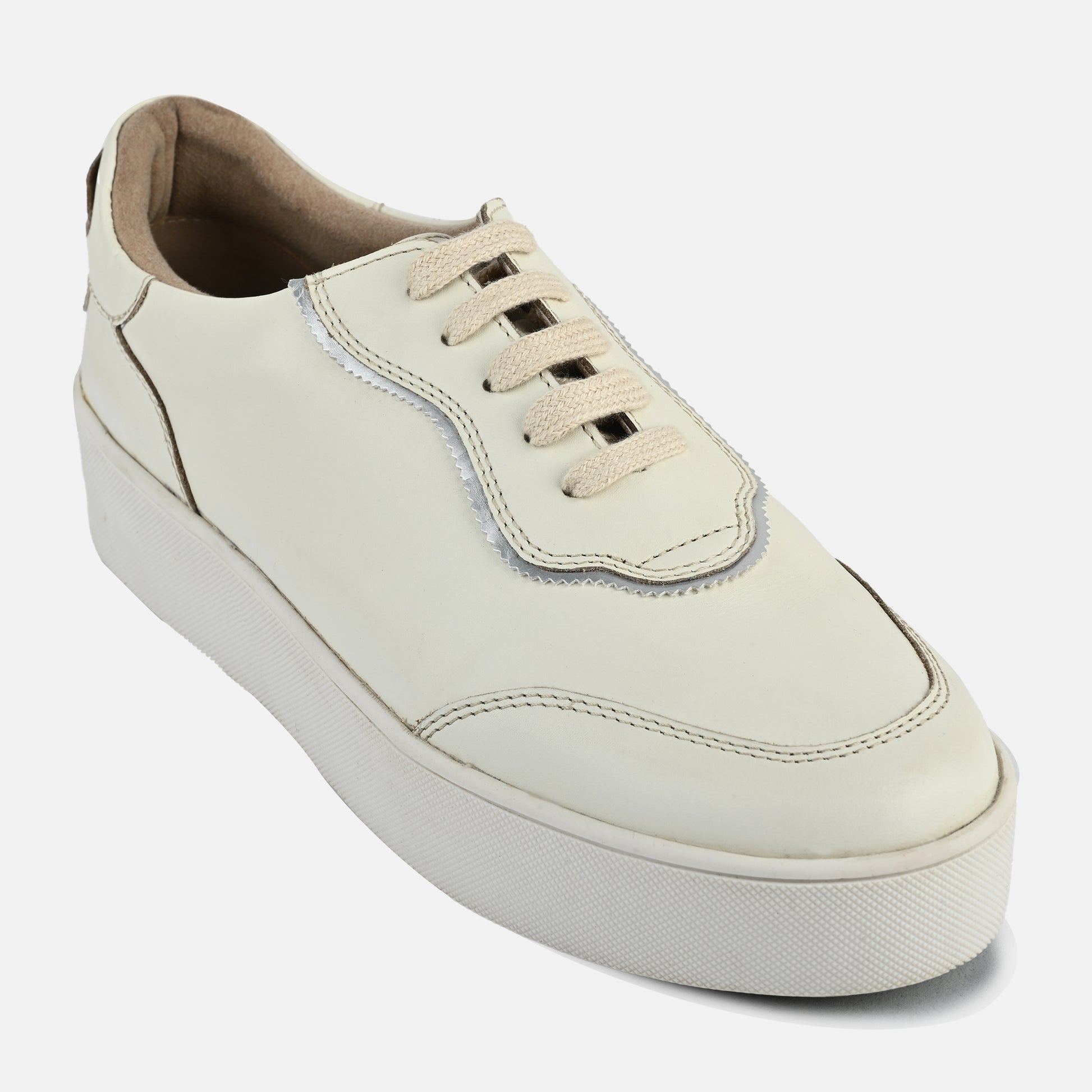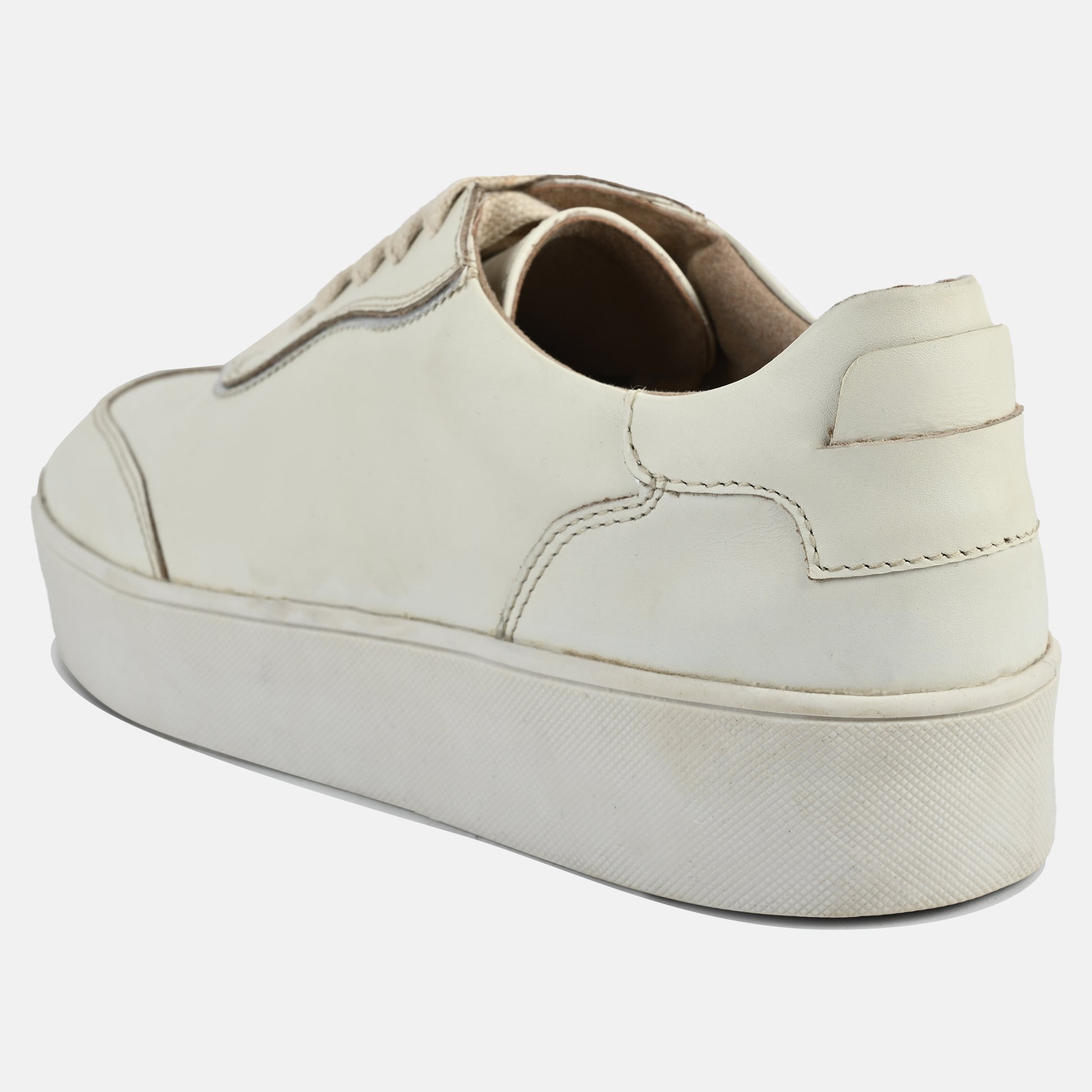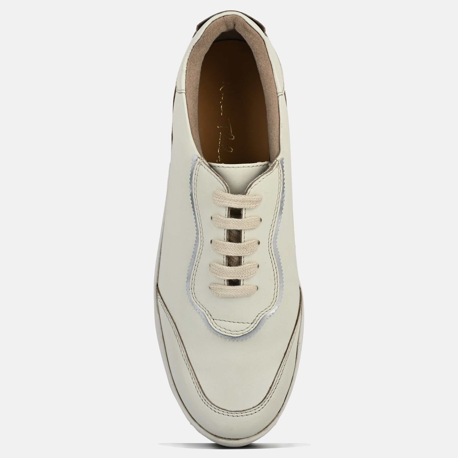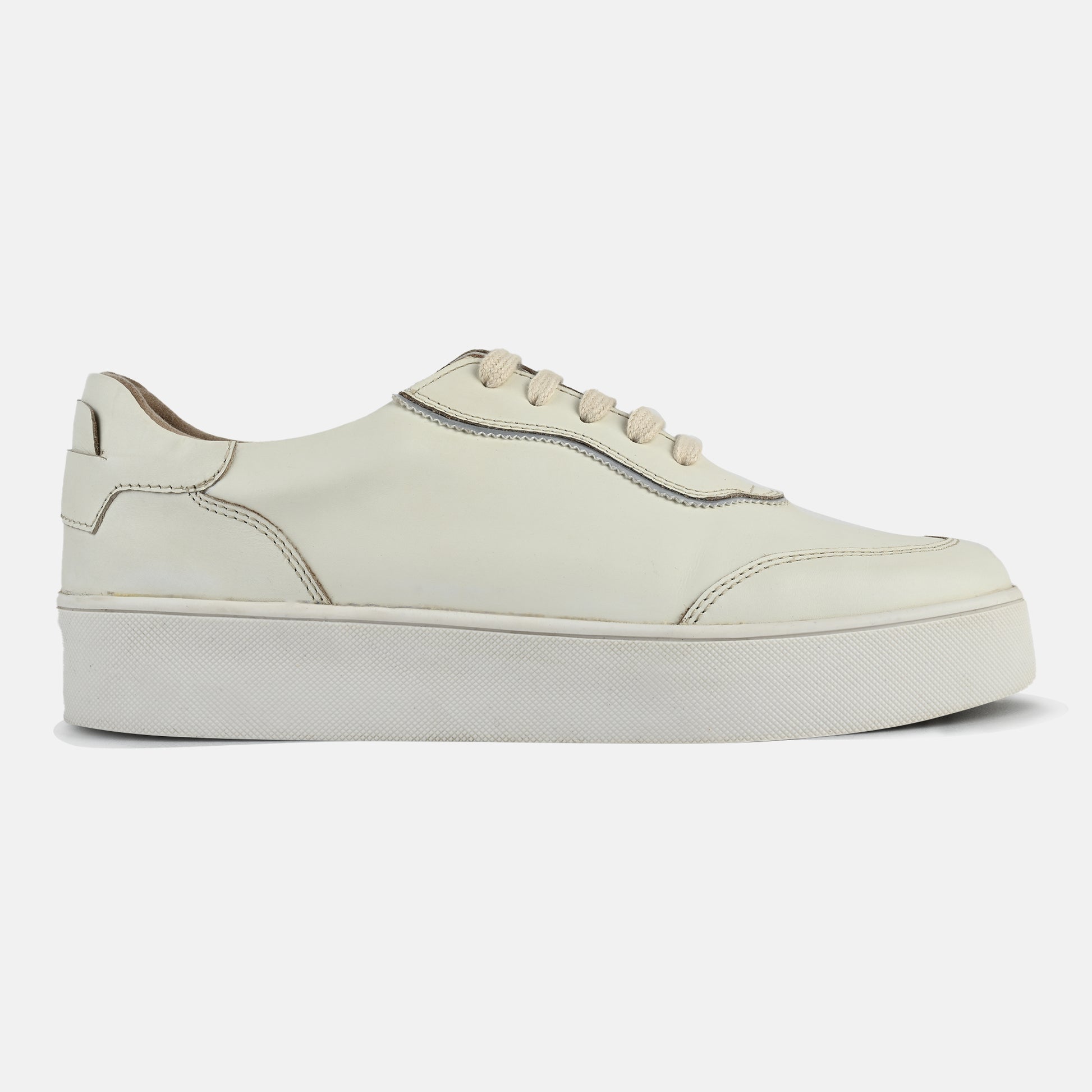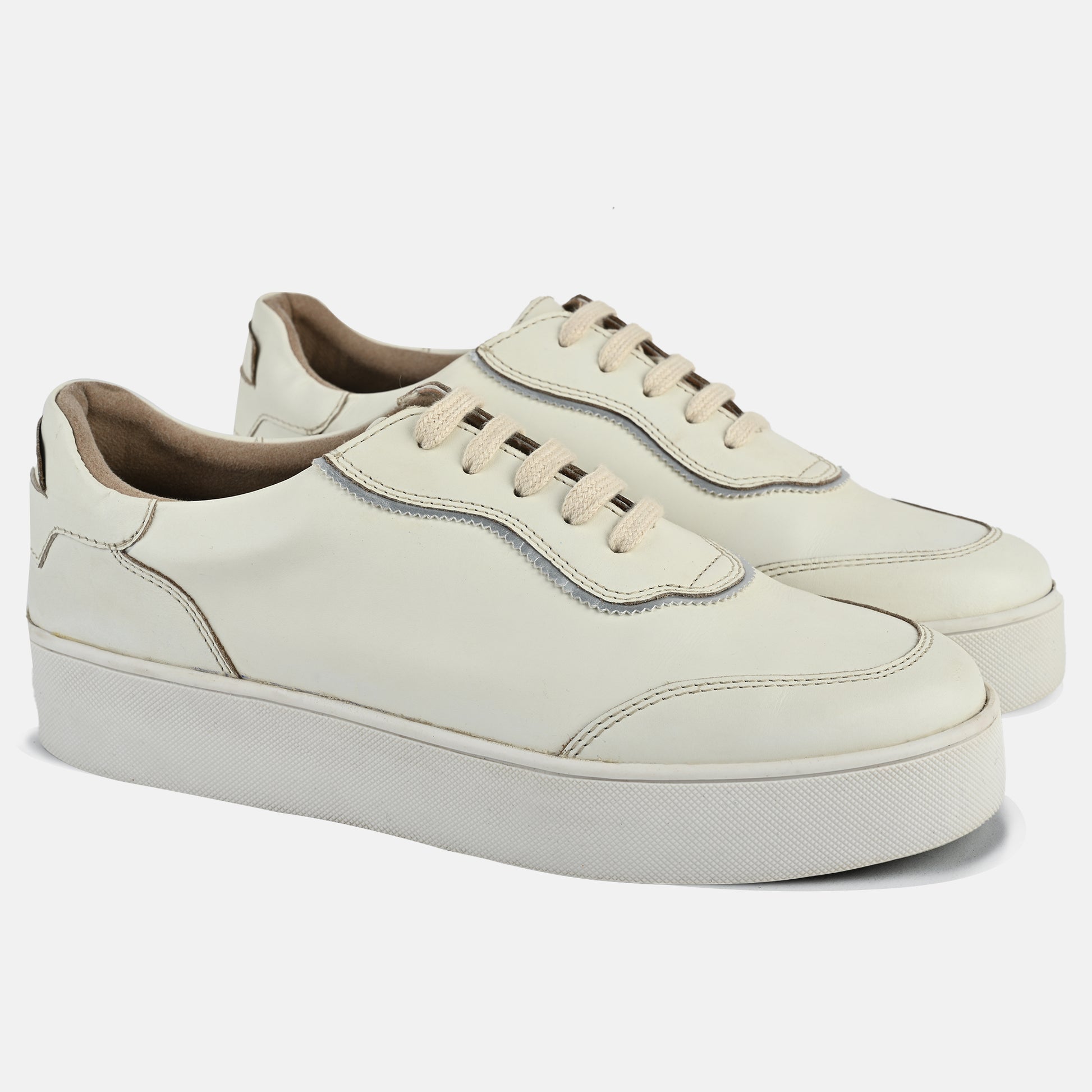 Embrace the purity of high-end minimalism with our Ivory Cloud Platform Sneakers, a masterclass in clean lines and architectural grace. These sneakers are expertly crafted from buttery-soft, premium calf leather in a luminous Ivory White that radiates a sense of quiet, understated luxury. The upper features a seamless, multi-paneled construction with fine tonal top-stitching, creating a sleek and sophisticated silhouette that elevates the classic trainer to a piece of contemporary art.The defining feature is the sculptural platform sole, which provides a modern, elevated lift while maintaining a crisp, monochromatic aesthetic. Complemented by matching flat-woven cream laces and a refined, low-profile collar, every detail is engineered for the modern connoisseur of "Quiet Luxury." These sneakers are more than just footwear; they are an essential foundation for a curated, high-fashion wardrobe