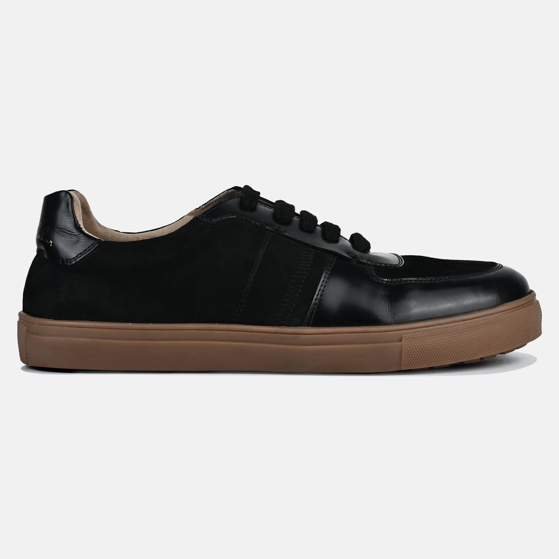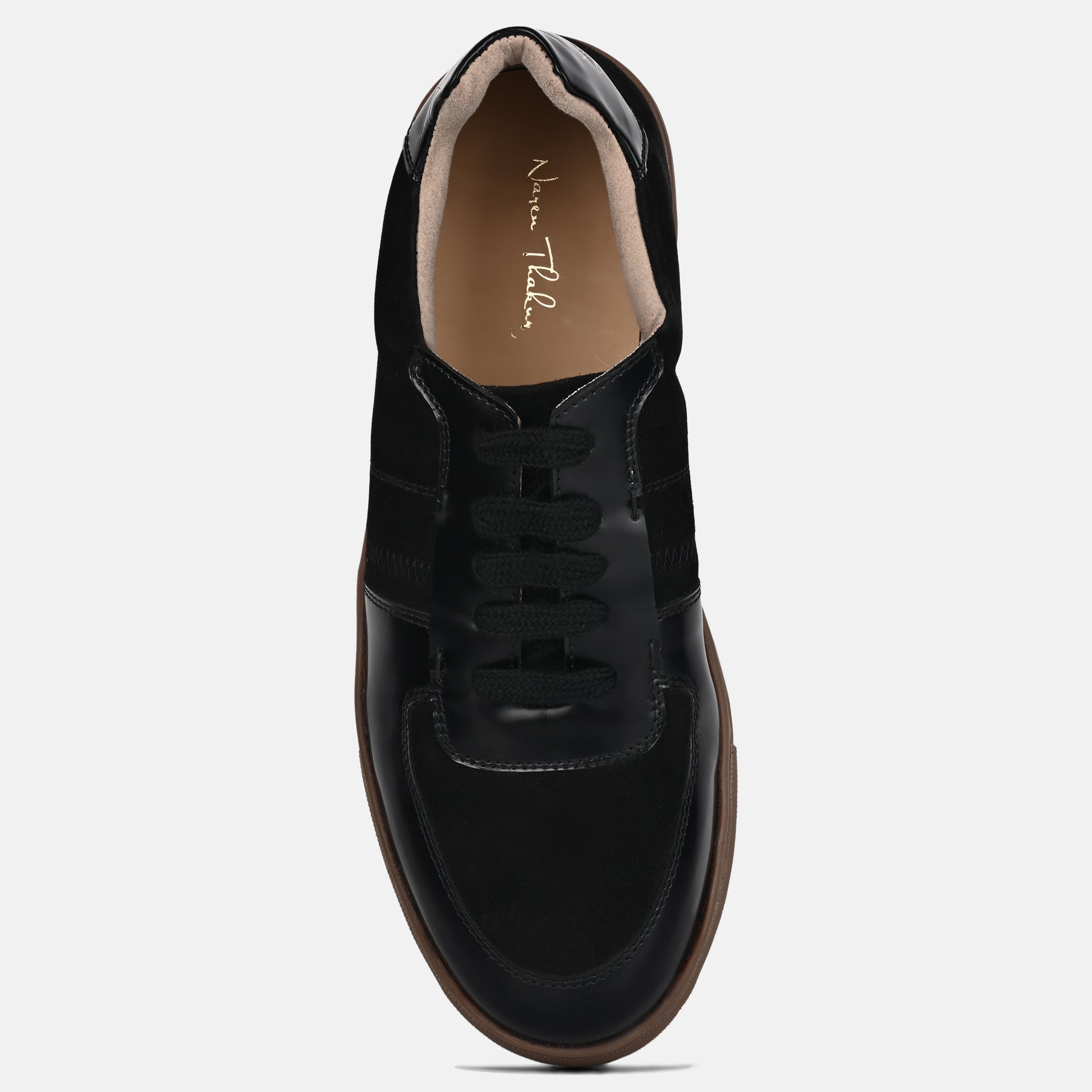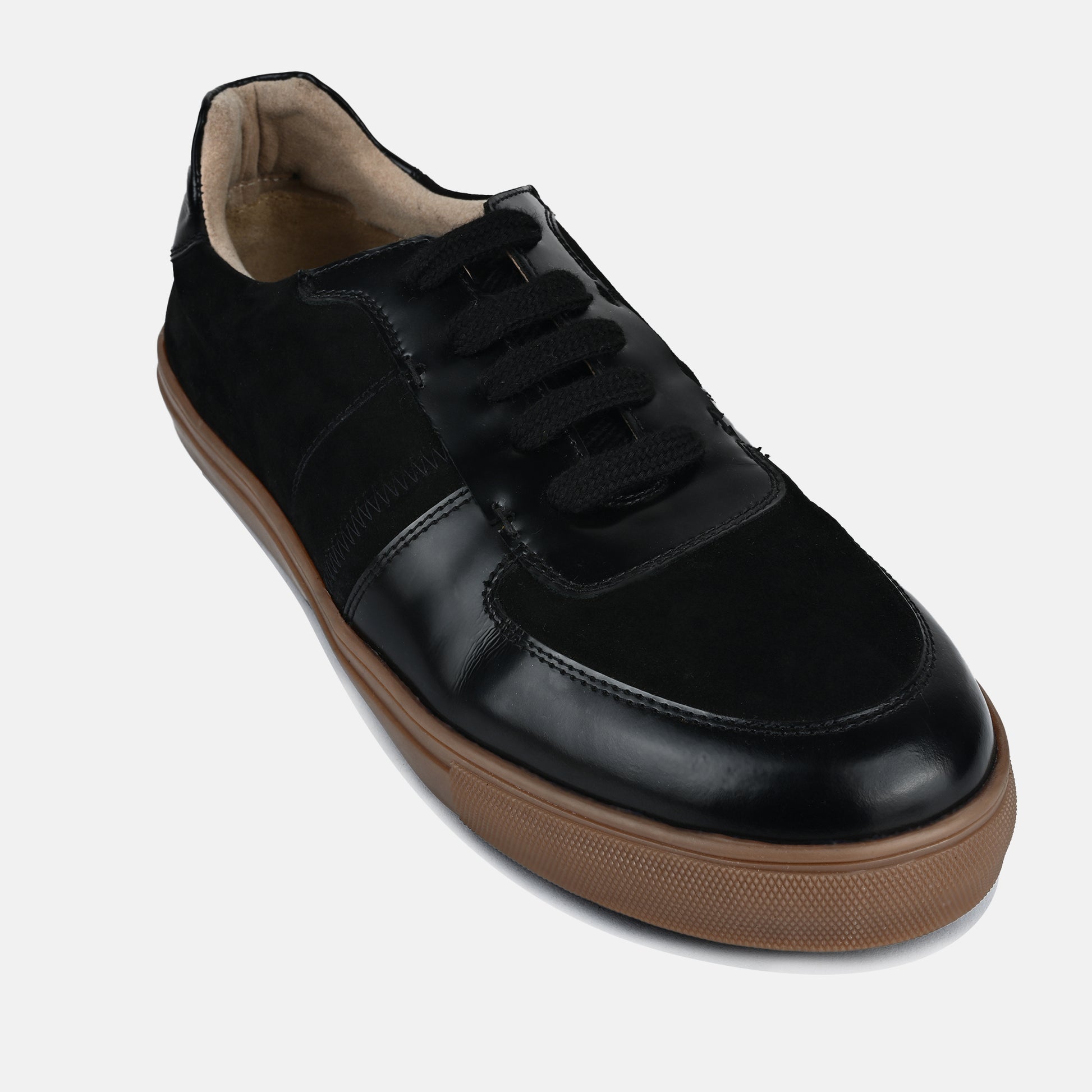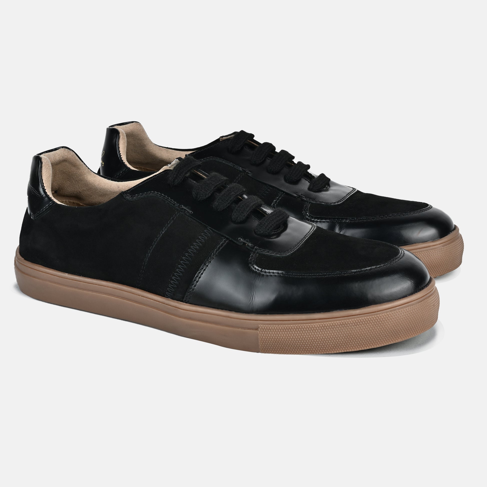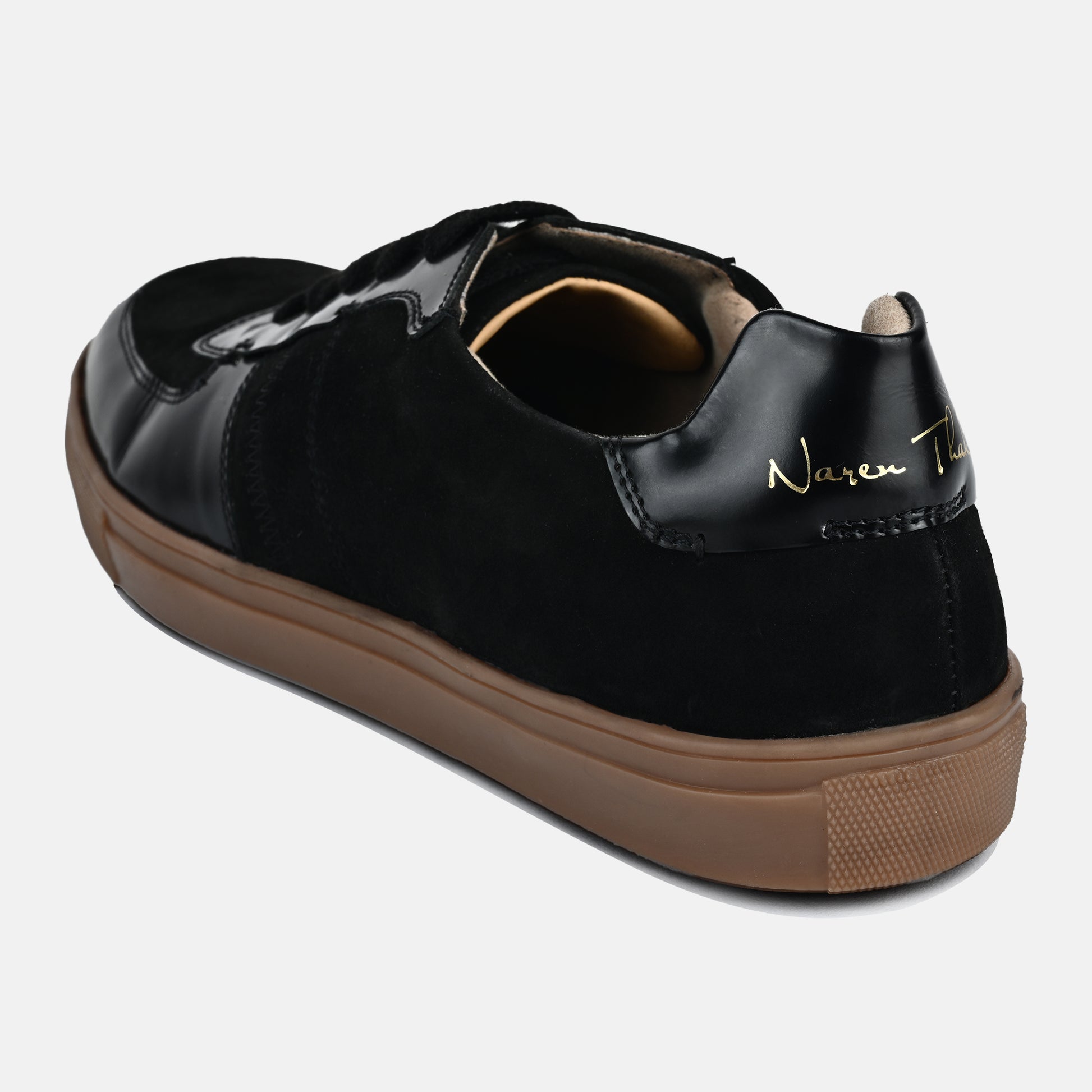 Redefine the concept of luxury casual with these Dual-Texture Onyx Sneakers, a masterclass in tonal depth and high-end material play. This pair features a sophisticated juxtaposition of patent high-shine leather and matte technical suede, creating a visual rhythm that is both avant-garde and timelessly elegant. The deep black upper is hand-finished to a mirror-like gloss on the toe and quarters, while the textured overlays provide a soft, velvety contrast that speaks to the highest level of craftsmanship.The silhouette is anchored by a warm chestnut-toned architectural cupsole, offering a rich earthy counterpoint to the monochromatic upper. Every detail is considered, from the tonal waxed indigo laces to the precision-stitched paneled construction that ensures a structured, streamlined fit. These are not merely sneakers; they are a sartorial statement designed for the man who navigates the world with quiet confidence and an uncompromising eye for detail.