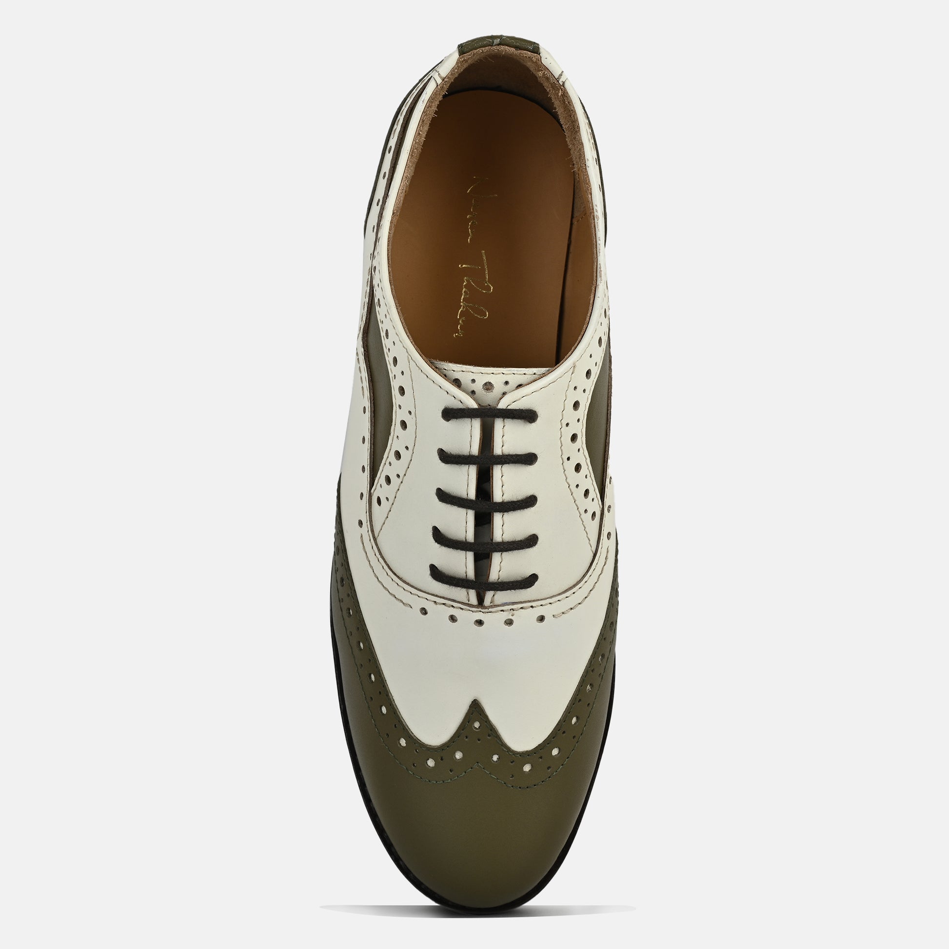 Step into a world of vintage prestige with these Artisan Spectator Brogues, a masterpiece designed for the woman who appreciates the finer nuances of sartorial history. These shoes are meticulously crafted from ultra-premium, smooth-grain calfskin, featuring a striking two-tone ivory and olive-drab palette that radiates high-society charm. The classic wingtip silhouette is defined by intricate perforated broguing along every seam, a testament to the patient hand of a master craftsman.The design features a traditional closed-lacing system with slender, waxed espresso laces that provide a sharp, secure fit. Every curve of the shoe is hand-burnished to achieve a soft, natural glow, ensuring the deep olive tones possess a rich, multidimensional depth. Grounded by a sleek, low-profile leather sole and a reinforced stacked heel, these brogues offer a structured yet incredibly graceful stride that whispers luxury with every step.